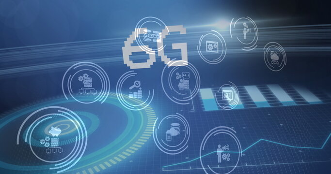 Image of 6g text and glowing interface with charts and business icons on dark background