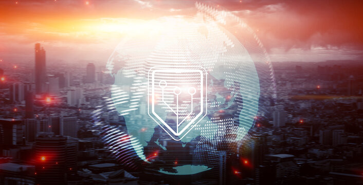 Security world global network protection in personal data, wireless data connection transmission technology, ai internet telecommunication connecting city people smart devices, sunset city background