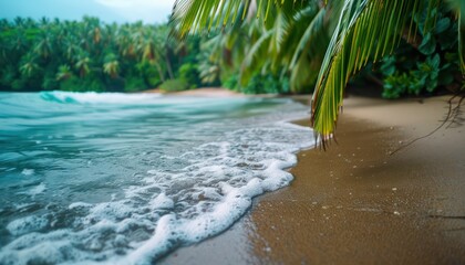 Tranquil Tropical Beach Scene with Soft Sand, Gentle Waves, and Lush Greenery, Perfect for Relaxation and Escape