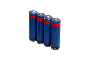Four blue cylindrical batteries with red labels, each marked with "3.6V" and "3.2Ah", standing upright in a row on a white back