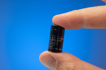 Small cylindrical PX28 Alcaline battery held between fingers by Caucasian male. Recycling concept, close up studio shot, isolated on blue background