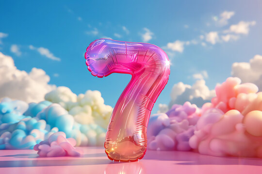 Bright rainbow inflatable balloon number seven on festive pastel background.