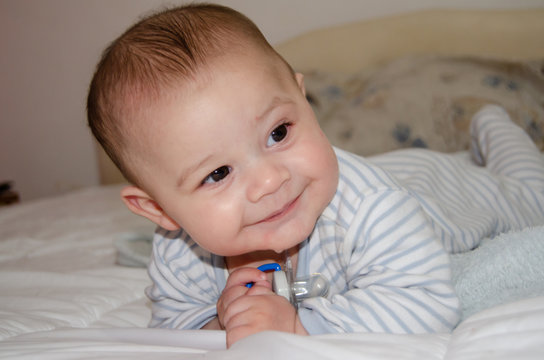 Laughing Mixed Race Baby Boy Lying On Tummy At Home