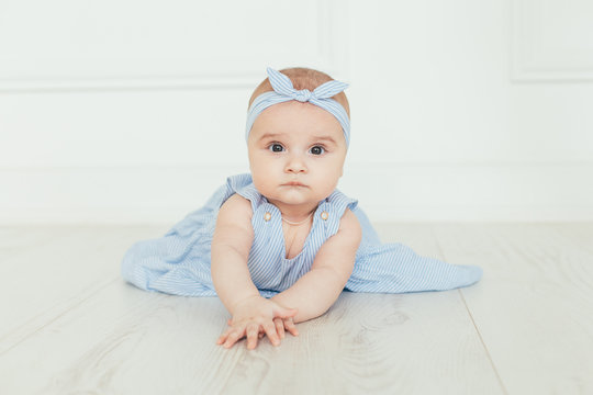 the baby is six months old. 6 months old cute baby portrait. 6 digit offspring. Portrait of a smiling baby, 6 month old baby lying.
