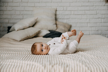 Happy baby on a white blanket. Motherhood and health. 4 month old baby