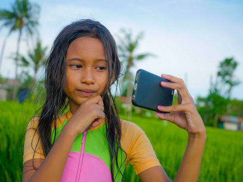 7 or 8 years old sweet and pretty female child outdoors at rice field landscape taking selfie portrait  photo with mobile phone camera enjoying holidays