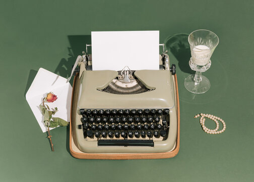 Retro styled scene with a typewriter, white letter, drinking glass, dry rose flower, and pearl bracelet with strong shadows against a green background. Minimal vintage aesthetics. Art direction.