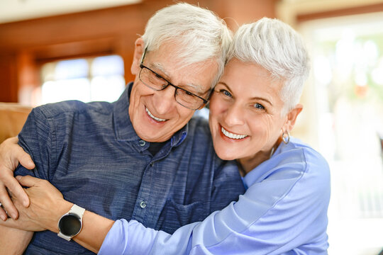 Portrait of happy senior grandfather sitting on couch looking at camera demonstrating white healthy teeth in smile. Satisfied elderly man patient having healthy habit of regular visiting dental clinic