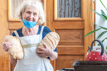 Elderly woman in protective mask bakes bread at home in the kitchen. Quarantine coronavirus covid-19. Good housewife grandmother with homemade breads. Stay at home. Homemade food. Old woman cook