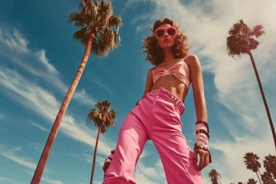 portrait of a cool girl with rollerblades on a sunny day, urban street with palms, evocative 70s era