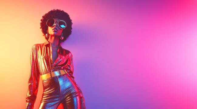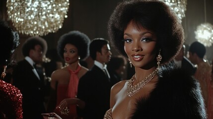 A glamorous 70s black fashion scene, featuring elegant evening gowns, fur stoles, and glitzy jewelry, highlighting black glamour of the disco era