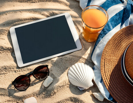 Vacation Mode- Beach Accessories- A cheerful image of beach accessories, including a digita_1(720)
