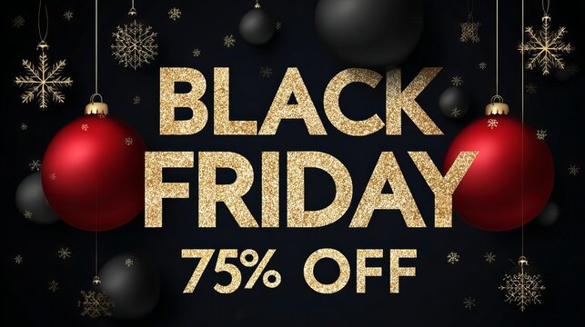 Stunning Black Friday 75% Off sale with festive ornaments and snowflakes, creating an elegant holiday shopping atmosphere.