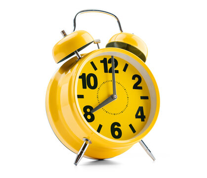 Bright yellow retro alarm clock with twin bells on transparent background. Classic style showing 8:00. Great for time-related designs and wake-up concepts in PNG format.