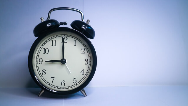 Eight o'clock on the alarm. A white alarm clock is on a white table. The clock hand points to 8 o'clock. Time to change to summer or winter time. Set an alarm for 8:00 or 20:00. copy space