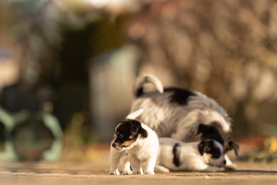 Pups 3,5 weeks old. Purebred newborn very tiny Jack Russell Terrier puppy dogs plays with the siblings