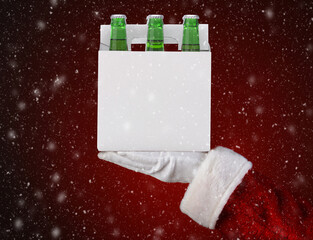 Closeup of Santa Claus holding a 6 pack of beer in the palm of his outstretched hand.