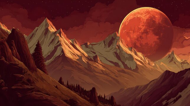 Pixel Art Mountain Landscape with Large Orange Moon and Starry Sky Pixelated Mountain Range Under Glowing Moon with Trees and Detailed Texture