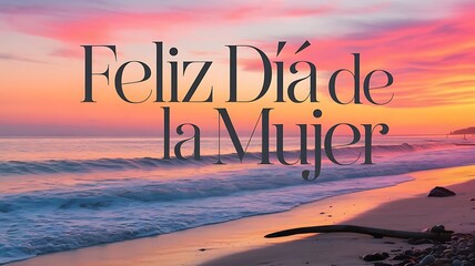 Feliz Día de la Mujer calligraphy text in Spanish Happy Women's day illustration on sea beach background landscape