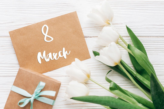 8 march text sign on stylish craft present with greeting card and tulips on white wooden rustic background. flat lay with flowers and gift with space for text. greeting card