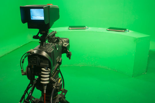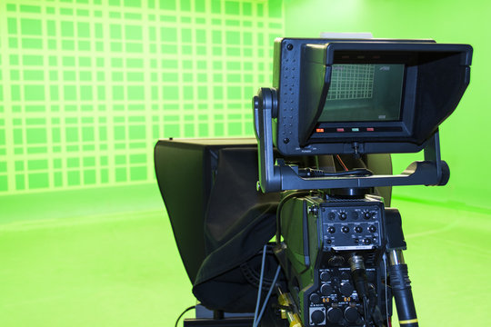 LCD display screen on a High Definition TV camera in a green screen studio..