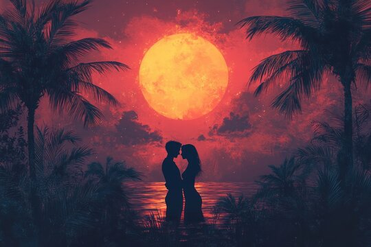 Couple Kissing in Tropical Paradise with Vintage Sunset and Palm Trees in Retro Futuristic Style