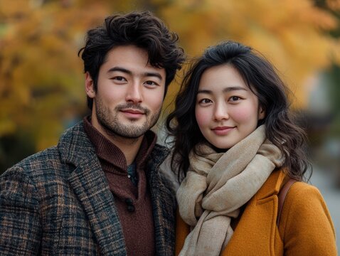 asian couple in autumn background, aged 80s photo retro style