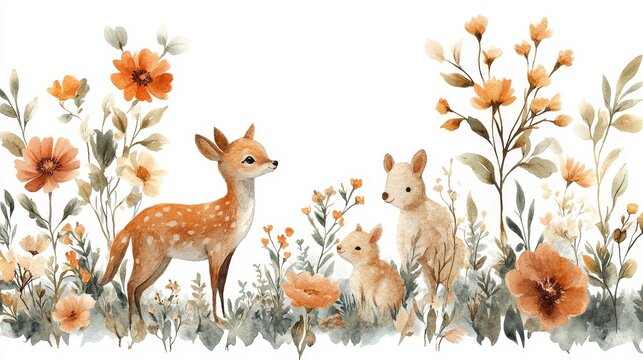 Boho baby shower wreath clipart featuring soft flo 836 animal, fox, deer, wildlife, mammal, nature, wild, cartoon, cute, animals, white, fawn, red fox, vector, isolated, red, doe, grass, illustration,