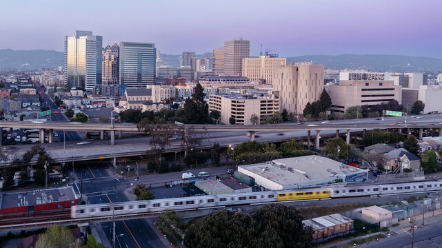 Downtown oakland, BART train and interstate 880 freeway at sunset, California, United States of America.
