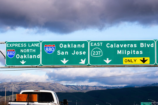 Highway 880 and Highway 237 interchange in South San Francisco Bay Area; Freeway signage providing information about the lanes going to Oakland and San Jose, California