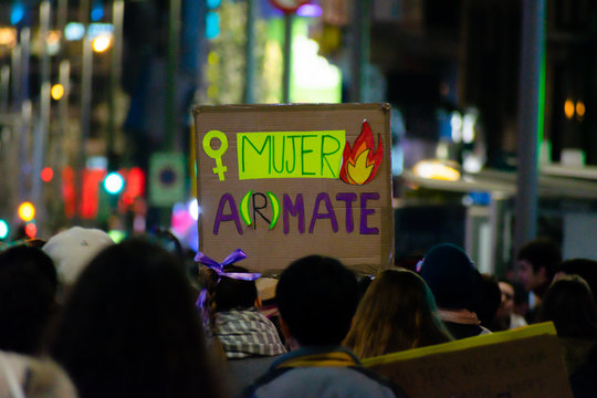 MADRID, SPAIN - MARCH 8, 2019: Massive feminist protest on 8M in favour of women's rights and equality in society. Protest posters could be seen during the demonstration