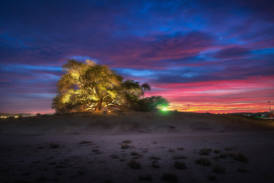 Beautiful sunset view from Tree of Life, Bahrain. The Tree of Life in Bahrain is a 9.75 meters high Prosopis cineraria tree that is over 400 years old