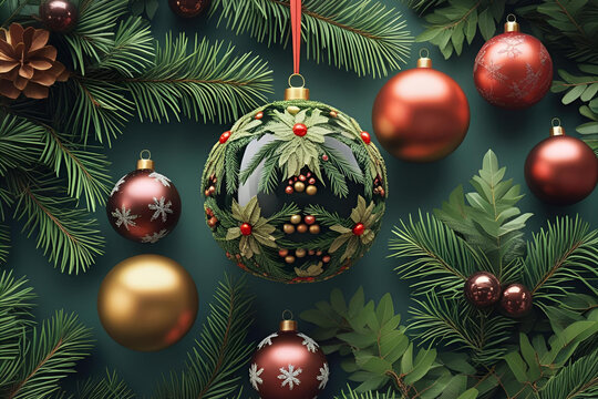 3D Render of Christmas Baubles and Pine Leaves - 1