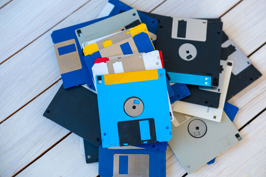 Colorful pile vintage 3.5 inch floppy disks on wooden surface, retro computing, obsolete data storage, tech nostalgia, digital history, collection old media formats 80s, 90s, nostalgic tech memory