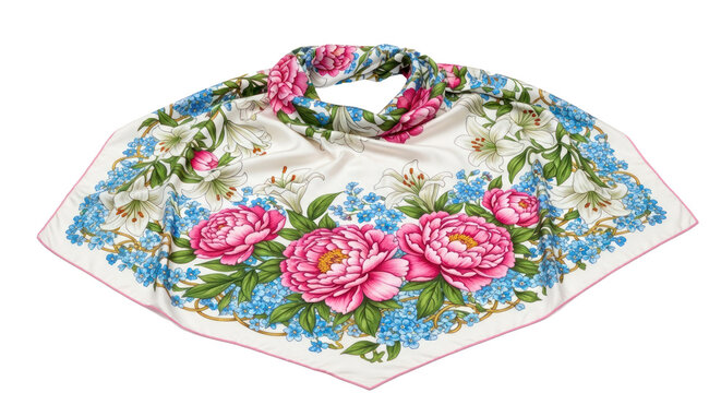A white scarf with floral patterns and dimensions of 90cm x 90cm.