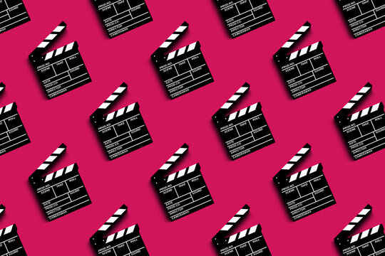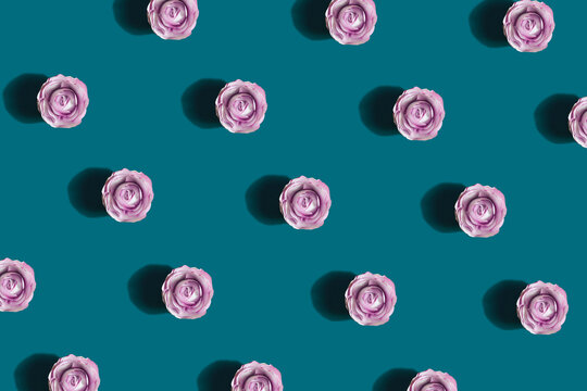 Decorative spring pattern made of pink paper rose flowers on dark cyan background. Nature flat lay. Minimal spring concept.