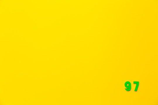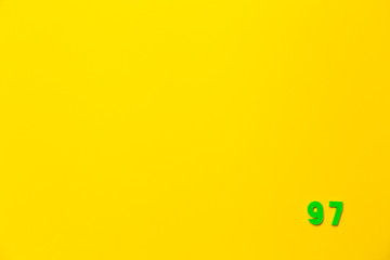 A green plastic toy number ninety-seven is located in the lower right corner on a yellow background