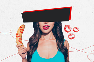 Photo collage composite trend artwork image of young lady eat hold in hand cover face with tasty sweet donuts cakes unhealthy calories
