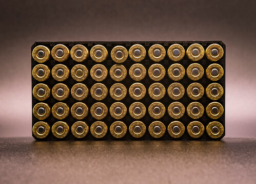 Many brass gun bullets on a black table closeup. Free copy space for text.