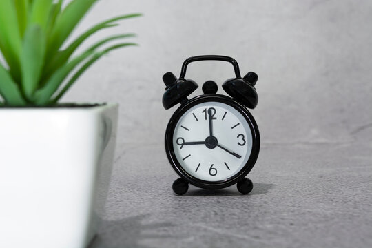 Black alarm clock isolated. The clock set at 9 o'clock. Deadline concept.