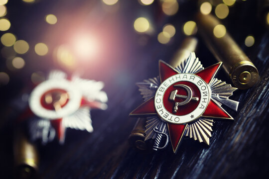 The Soviet order of the Second World war, Victory Day 9 May postcard concept, toned vintage
