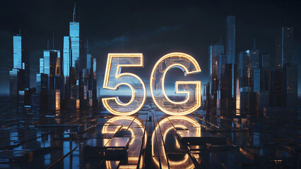 Glowing five g symbol with circuit board design reflecting in a futuristic city landscape background