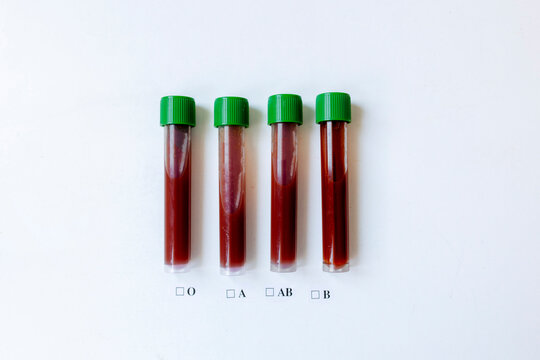 Four blood test vials with green caps labeled with blood types A, B, AB, and O.