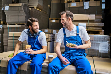 Two happy workers having lunch break in factory