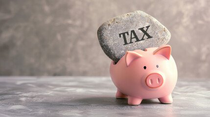 Piggy bank with a heavy stone labeled tax, symbolizing financial burden or tax pressure, on a gray background.