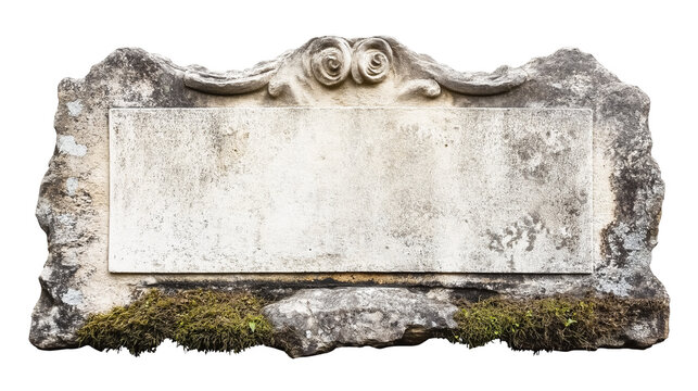 old memorial grave stone sign plate marble stone frame isolated on white transparent background, cut out