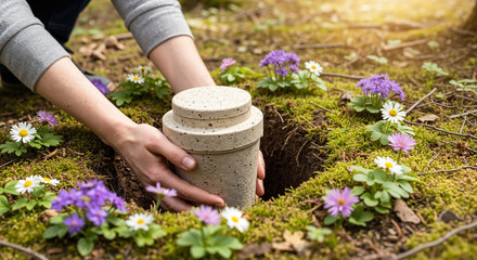 Picture of a unhappy lonely young person standing at the grave on cemetery generative ai image