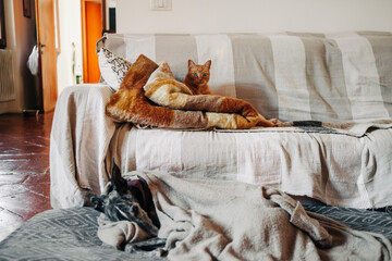 Portrait of a funny beautiful red fluffy cat with green eyes in the interior, pets