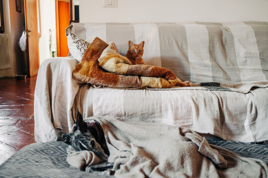 Adorable ginger cat relaxing on ground