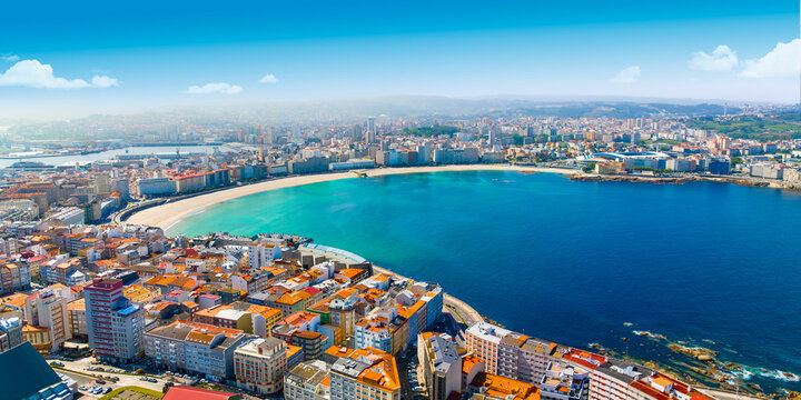 A Coruna city, aerial perspective. Old historic center of the city.  Panoramic aerial view of all Region. Famous travel destination in Galicia, northwest of Spain. Promenade and beach area of the city